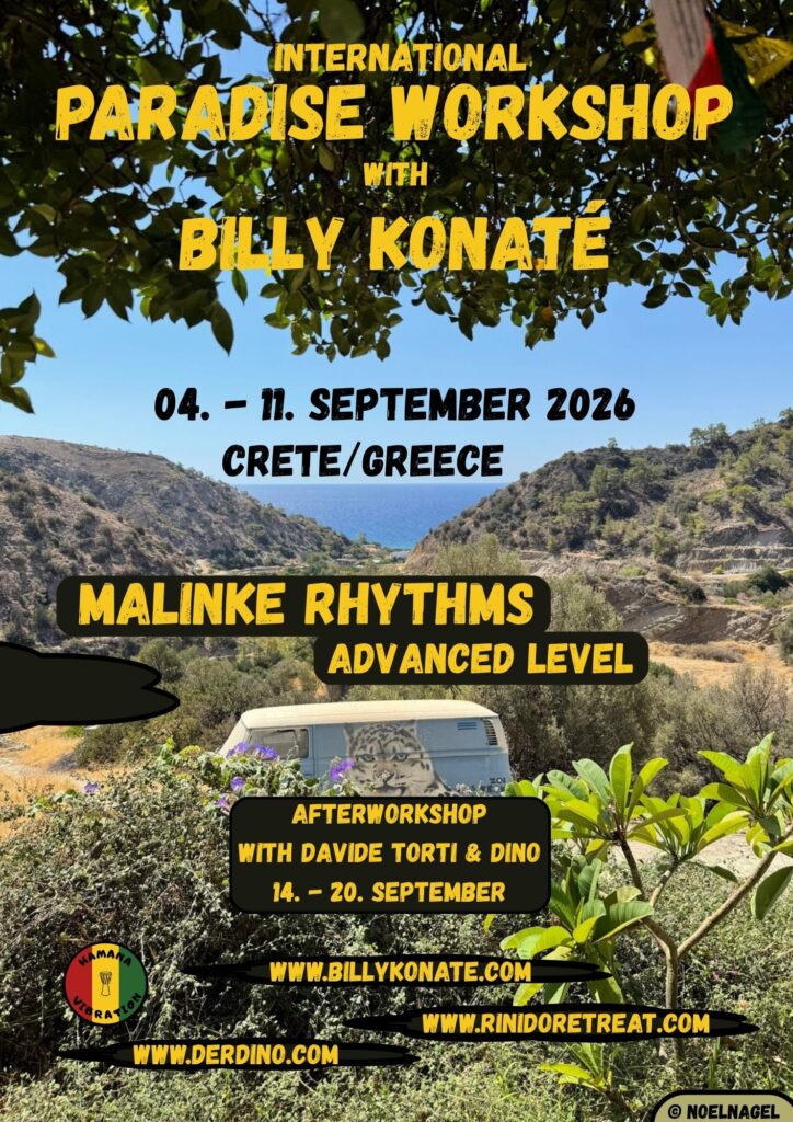 - 04. — 11.09.26 mit Billy Konaté in Tertsa bei Ierapetra, 30 Std., 460 €, www.rinidoretreat.com