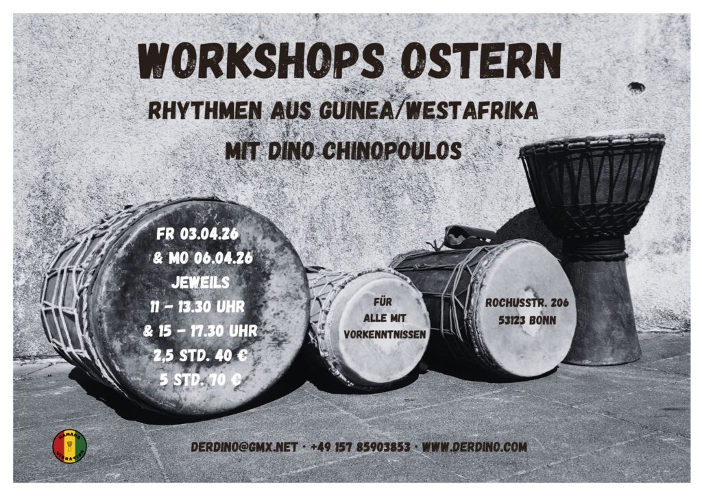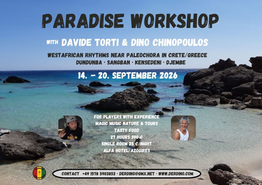 - bei jedem Workshop für erfahrene Spieler wird ein gesamter neuer Rhythmus (Basstrommeln und Djembé) vermittelt